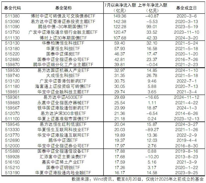 截至8月20日,易方达中证香港证券投资主题ETF7月以来的资金净流入额已经高达142.38亿元,而该基金今年上半年是资金净流出的。这不是个例,记者根据Wind数据统计发现,有260只非货ETF7月以来的场内资金净流入额已超过今年上半年(仅统计2025年之前成立的ETF),其中仅7只为债券类,其余全部为权益类(见表)。